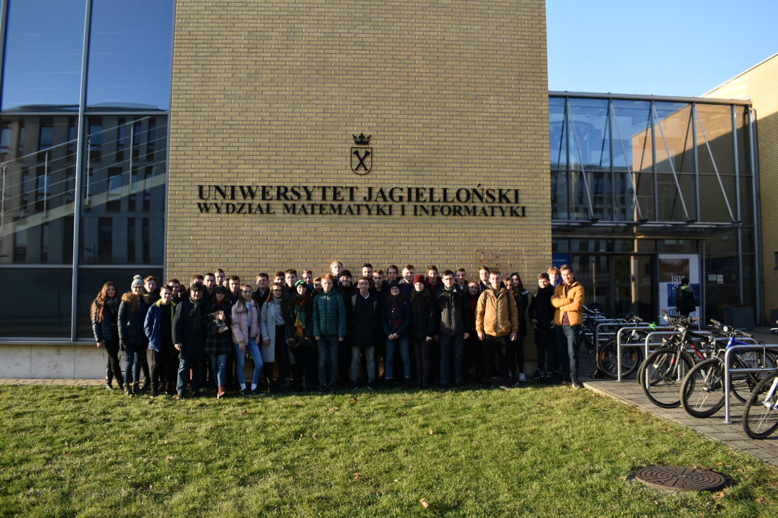 5 grudnia 2019 roku klasa 1bg wraz z sympatykami z klasy 2b uczestniczyła w kolejnym Matematycznym Czwartku na Uniwersytecie Jagiellońskim. Po przyjeździe do Instytutu Matematyki i krótkim spacerze po korytarzach przesiąkniętych atmosferą wyższej matematyki spotkało nas nieoczekiwane zdarzenie: alarm przeciwpożarowy i ewakuacja całego Instytutu! Dobrze, że to był tylko próbny alarm, bo zapewne dla wielu rozdyskutowanych brodatych studentów mógłby nie zakończyć się szczęśliwie. Jedno jest pewne uczniowie I LO to mistrzowie świata w ewakuacji w porównaniu do ich starszych kolegów.